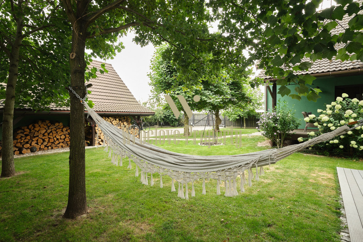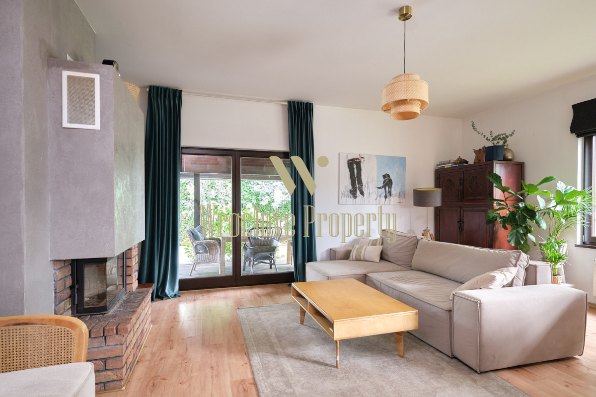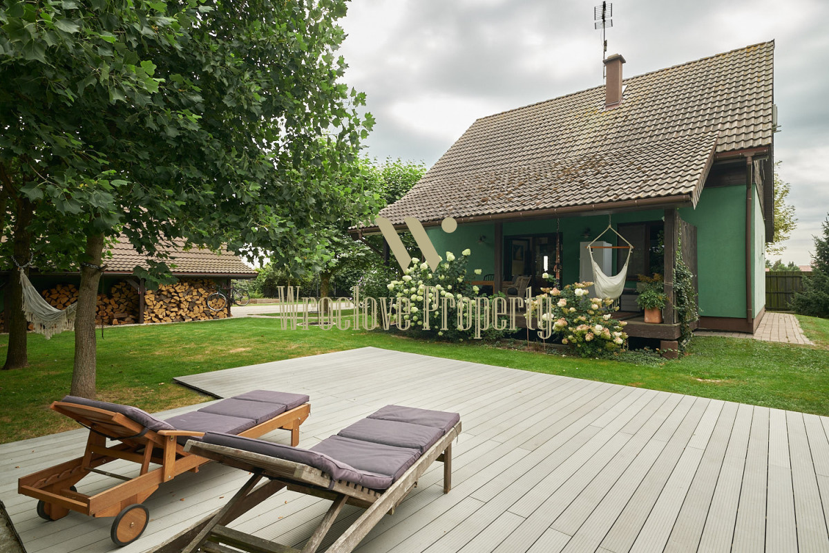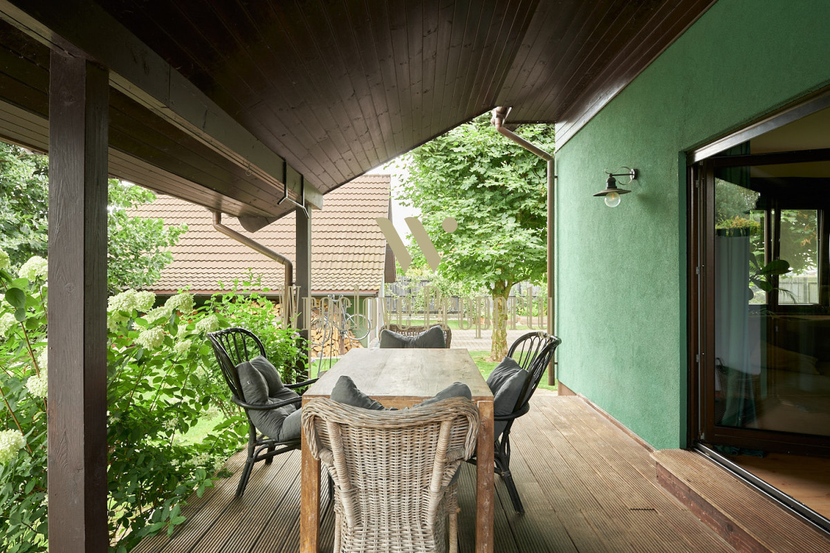 Z salonu jest wyjście na duży, zadaszony taras. Kolejny taras w ogrodzie.