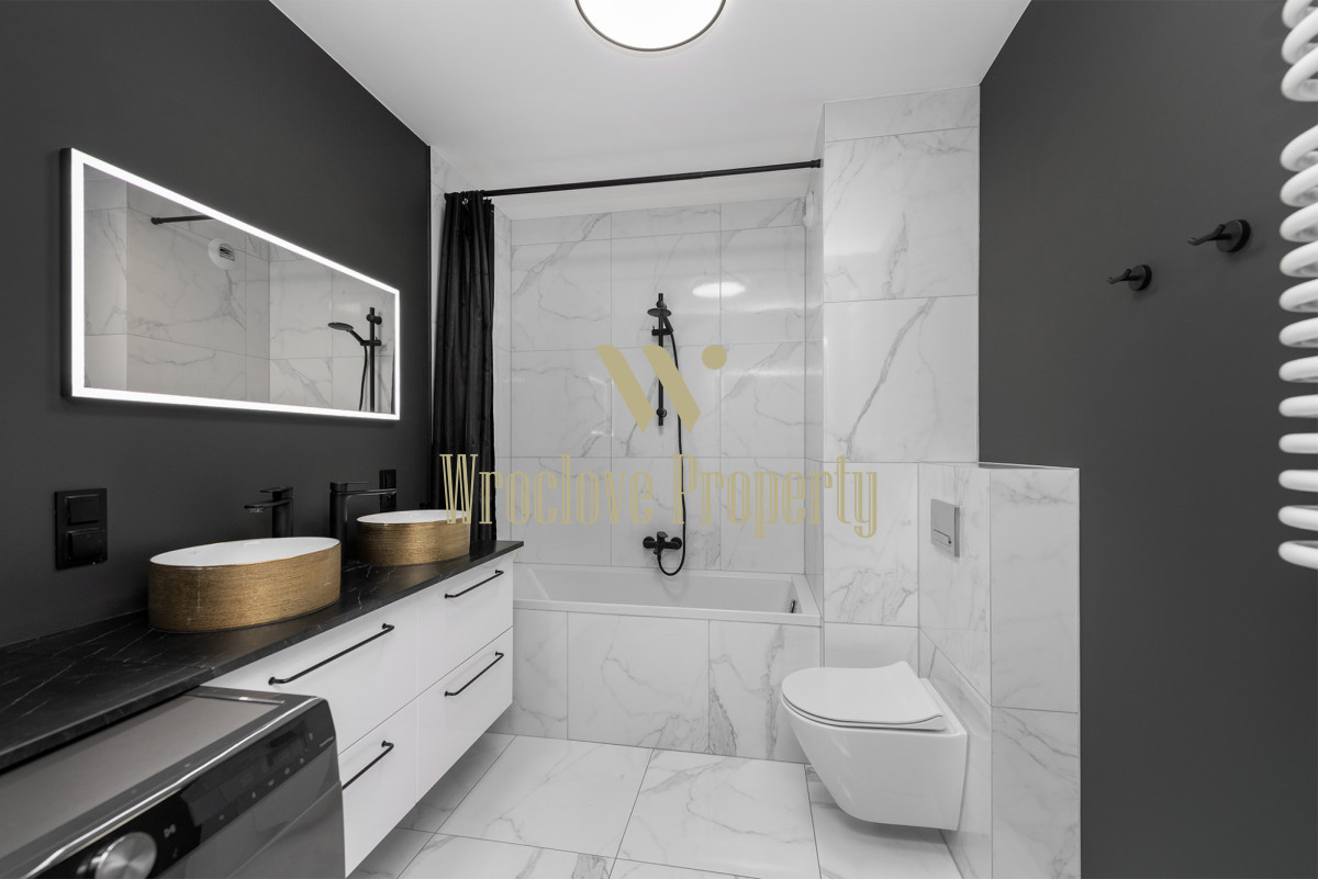 Łazienka - elegancka, z dwiema umywalkami, wanną, WC i pralką. Podświetlane lustro podkreśla nowoczesny charakter pomieszczenia.